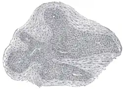 Section of an irregular nodule of the glomus coccygeum. X 85. The section shows the fibrous covering of the nodule, the bloodvessels within it, and the epithelial cells of which it is constituted.