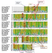 Human CCDC42B gene is found in ~58 orthologs species.[5] CCDC42B higher conservation in many mammalian orthologs species compared to non-mammalian orthologs species. Higher conservation of CCDC42B gene in several strict orthologs (mammalian): chimpanzee, rhesus monkey, dog,cow, mouse, rat and chicken, and identities that range between 95%-69%. Lower conservation of CCDC42B gene in distant homologs (non-mammalian): birds, reptile, amphibians and fish and identities that range between 23%-40%. The figure shows comparison between strict orthologs and distant homologs for conservation of CCDC42B (purple color: matched amino acid residues ; blue: conserved residues ; pink: similar residues ; white: different residues )
