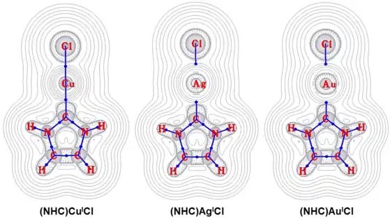 A Natural Bond Orbital analysis provides calculated charge distributions, which indicate increased NHC carbene p(π) orbital population relative to the free NHC; this can be attributed to increased NHC aromaticity when coordinated to a metal center.[13] Topological analysis of the electron density also shows that all three M-NHC bonds have meaningful ionic character in addition to some covalent character.[13] The Ag-NHC bond shows the most ionic character, while the Au-NHC bond shows the most covalent character.[13] For a series of M(NHC)(halide) and M(NHC)2 complexes studied by Nemcsok et al., Energy Decomposition Analysis assigns 68-78% of the attractive interactions to classical electrostatic attraction.[18] Again, the Ag complexes have the lowest calculated M-NHC bond dissociation energies with the highest calculated M-NHC ionic character percentages, while the Au complexes have the highest calculated M-NHC bond dissociation energies with the lowest calculated M-NHC ionic character percentages; the Cu values are intermediate.[18] (Note that electrostatic contributions are just one part of the overall bond dissociation energy calculations; while the Ag-NHC bonds have the greatest percentage of electrostatic contributions into the overall bond dissociation energies, the Au-NHC bonds have the greatest bond dissociation energies in magnitude).[18] Of the remaining covalent character, the majority is calculated to emerge from σ donation; the Cu complexes have the highest calculated percentages of π back-donation contribution.[18] These trends generally match the observations for coinage metal bond strengths where Au > Cu > Ag bonds.[19] Experimental bond length analyses corroborate the computational results, especially with regard to the relative levels of NHC aromaticity and the relative levels of back-donation.[13][16]