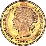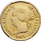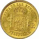 1 peso | 15 mm | 1.69 g | 87.5% gold | Reeded | Queen Isabela II or King Alfonso XII |
