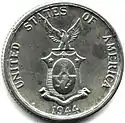 The reverse of the coins comes in two varieties. The earliest coins were minted when the islands were a US Territory, and they bear the arms of the US Territories. This is a broad winged eagle, sitting atop a shield divided into two registers. The upper register has 13 stars, and the lower register has 13 vertical stripes. The date appears at the bottom, and "United States of America" appears at the top.