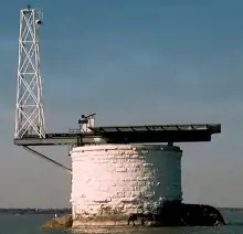 ![]() 2003 Photograph of the south side of the Colchester Reef Lighthouse in Western Lake Erie. Original structure built in 1885 (white caisson pictured here) and existing helipad and tower were installed / updated in the early 1980s. | |