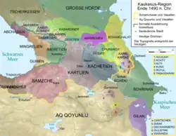 During this time, George VIII confronts Constantine II in Kartli, before being defeated thanks to the military support of Samtskhe.[24] He died in 1476 and was replaced by his son, Alexander I of Kakheti.[25] The latter makes no claim to the "all-Georgian" crown and negotiates borders with Tbilisi, sparing his kingdom from a possible invasion by Constantine II; he embarked on an independent foreign policy, sending embassies to Grand Duchy of Moscow.[26]
