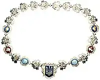 The sign (collar) of the President of Ukraine weighs about 400 grams. The president's collar is not obligatory, but most European heads of state have such a decoration: for instance, the president's collar (male jewelry like a female necklace) is one of the symbols of state power in Bulgaria and Poland.[1] Some countries grant another collar to the new head of the state, and the previous one passes to the national museums. An open-work chain with a historical relic – an amulet which, as the legend reads, belonged to Ukrainian Hetman Ivan Mazepa – was among the attributes of the President of Ukraine in exile.
