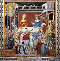 The attribution of the New Testament cycle to Lippo Memmi, perhaps assisted by his brother Federico Memmi and father Memmo di Filippucci, is now generally agreed.[13] Lippo Memmi was influenced by his more famous brother-in-law, Simone Martini.[7] Lippo Memmi also painted a large Maesta in the Town Hall of San Gimignano, in imitation of that done by Simone Martini at the Town Hall of Siena. The New Testament cycle of the right aisle appears to pre-date the Old Testament cycle and is generally accepted to date from c.1335-1345.[15]