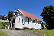 Saint Cuthberts was completed in 1873 and built on land believed to have been donated by the town's founder William Gibbs. Local labour and timber were donated to complete the church. Thomas Brunner designed the church. The church having survived unscathed from the many fires that have damaged Collingwood is a New Zealand Heritage category 1 listed building.[15] The church suffered some minor damage from vandals who were caught and prosecuted in 2011.[16] The church seats approximately 50 people. The congregation numbered approximately 20–25 persons in 2016.[17]