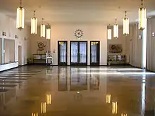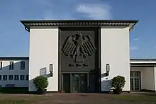 The landside portal of the lobby is decorated with a relief made by the sculptor Willi Meller, and features the eagle of the Weimar Republic and three crowns derived from coat of arms of Cologne.