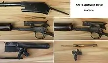 The Colt Lightning Carbine or Colt Lightning Rifle was a slide-action (pump-action) rifle manufactured by Colt from 1884 until 1904 and was originally chambered in .44-40 caliber.[1][2] Colt eventually made the Lightning Rifle in three different frame sizes, to accommodate a wide range of cartridges, from .22 Short caliber and .38-40 to .50-95 Express.[3] Its profile resembles the pump-action rimfire rifles made by the Winchester Repeating Arms Company and Remington Arms.[2] The Lightning saw use as a sporting arm in America and was adopted for use by the San Francisco Police Department, but was never as popular or as reliable as the various lever-action rifles of its day.[2]
