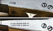 The frame of early Open Top revolvers were marked COLT'S/PATENT, later models sported the so-called "Two July" patent marking, also found on the 1851 Navy-, 1861 Navy- and 1860 Army-conversion revolvers. The "Two July" patents were also found on very early Colt Single Action Army revolvers.