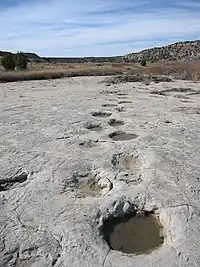 Picketwire Canyon is about 400 feet (120 m) deep and contains the Purgatoire River track site, one of the largest dinosaur track-ways in the world, in the Morrison Formation. More than 1,300 tracks of Brontosaurs and Allosaurs 150 million years old are preserved in the rocks.[15] The canyon and the dinosaur tracks are accessible by a hiking, biking, and horseback trail that leads 8.7 miles (14.0 km) one-way through the canyon to the Dolores Mission, the ruins of a small 19th century Catholic church, the dinosaur tracks, and the adobe-buildings of the Rourke ranch, which operated between 1871 and 1971 and is preserved as a National Historic Site. The trail is normally closed to motorized vehicles. On weekends in the fall and spring, rangers lead guided tours into the canyon in all-wheel drive vehicles with visitors providing their own vehicles.[16][17]