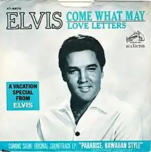 "Come What May" is a song written by Frank Tableporter and recorded by Elvis Presley on May 28, 1966. RCA Records released it as a single on June 8, 1966. The song is credited to Elvis Presley with The Jordanaires.[1] Document from the files of RCA Records listed the song as the A-side with "Love Letters" on the B-side for the 1966 release,[2] although other sources give "Love Letters" as the A-side and "Come What May" the B-side.[1] "Come What May" did not make the Billboard Hot 100, but listed as "Bubbling Under" at No. 109, and No. 94 on the Cash Box Top 100.[3]