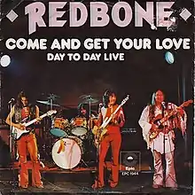 "Come and Get Your Love" is a song by American rock band Redbone.[3] The song was originally released as a promo track under the name "Hail" and was later featured on their fifth album, Wovoka (1973), under its current name. The song was released as the album's first single the following year. Written and produced by band members Pat and Lolly Vegas, it is one of the band's most successful singles. It made them the first Native American band to reach the top five on the Billboard Hot 100, reaching number five.[4] The song later appeared on many "greatest hits" albums released by the band, as well as on numerous compilation albums of the 1970s. A cutout style-animated music video was released in 2020.[5]