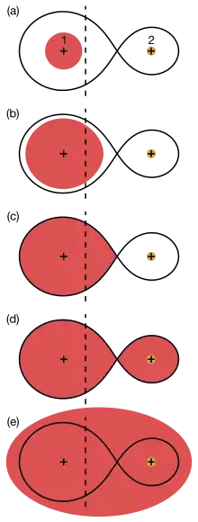 Stages in the life of a binary system as a common envelope is formed. The system has mass ratio M1/M2=3. The black line is the Roche equipotential surface. The dashed line is the rotation axis. (a) Both stars lie within their Roche lobes, star 1 on the left (mass M1 in red) and star 2 on the right (mass M2 in orange). (b) Star 1 has grown to nearly fill its Roche lobe. (c) Star 1 has grown to overfill its Roche lobe and transfer mass to star 2: Roche lobe overflow. (d) Transferred too fast to be accreted, matter has built up around star 2. (e) A common envelope, represented schematically by an ellipse, has formed. Adapted from Fig. 1 of Izzard et al. (2012).[6]