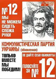 The KPU claimed that the formation of the KPU(o) was instigated by the political establishment to take votes from the KPU.[7] In the 2002 Ukrainian parliamentary election, the party won 1.4% of the popular vote and no seats although only six other parties had spent more on their election campaign.[8] In the 2007 Ukrainian parliamentary election, the party garnered only 0.29% of the popular vote.[1] The party did not participate to the 2012 Ukrainian parliamentary election[9][10] and the 2014 Ukrainian parliamentary election.[10][11]