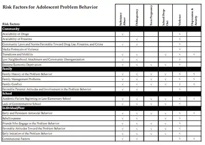 Risk Factors. Research has also identified risk factors that can interrupt the process of positive social development. High quality longitudinal studies have identified risk factors in neighborhoods and communities, families, schools, and peer groups, as well as in individuals themselves.[9][10][11] These factors increase the probability of delinquency, violence, substance abuse, teen pregnancy, dropping out of school, and other behavior problems in young people. The risk factors shown in the risk factor chart (right) have been found in at least two high-quality studies to predict later health and behavior problems in young people. Many of these risk factors predict multiple problems. For example, the risk factor of “Poor Family Management” has been shown to predict five youth problem behaviors: substance abuse, delinquency, teen pregnancy, school drop-out, and violence. Providing effective parent training programs in a community, therefore, could potentially impact all five of these undesirable outcomes.