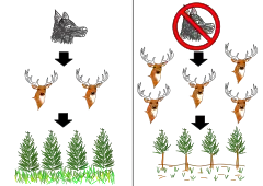 Keystone species have a disproportionate influence on the community than most species. Keystone species tend to be at the higher trophic levels, often being the apex predator. Removal of the keystone species causes top-down trophic cascades. Wolves are keystone species, being an apex predator.