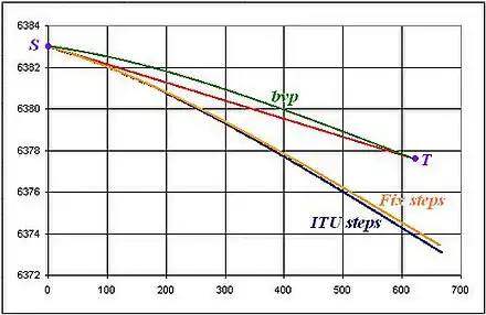 When a point S communicates with a point T, the orientation of the ray is specified by an elevation angle. In a naïve way, the angle can be given by tracing a straight line from S to T. This specification does not guarantee that the ray will reach T: the variation of refraction index bends the ray trajectory. The elevation angle has to be modified[3] to take into account the bending effect.