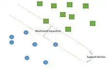 Support vector machine is by far the most frequently used classifier in vessel segmentation, up to 90% of cases. SVM is a supervised learning model that belongs to the broader category of pattern recognition technique. The algorithm works by creating a largest gap between distinct samples in the data. The goal is to create the largest gap between these components that minimize the potential error in classification.[82] In order to successfully segregate blood vessel information from the rest of the eye image, SVM algorithm creates support vectors that separate the blood vessel pixel from the rest of the image through a supervised environment. Detecting blood vessel from new images can be done through similar manner using support vectors. Combination with other pre-processing technique, such as green channel filtering, greatly improves the accuracy of detection of blood vessel abnormalities.[77] Some beneficial properties of SVM include[82]