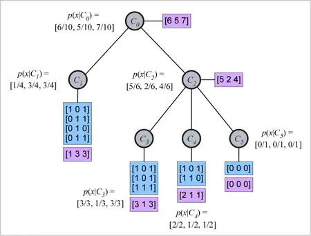 The figure to the right shows a concept tree with five concepts. is the root concept, which contains all ten objects in the data set. Concepts and are the children of , the former containing four objects, and the later containing six objects. Concept is also the parent of concepts , , and , which contain three, two, and one object, respectively. Note that each parent node (relative superordinate concept) contains all the objects contained by its child nodes (relative subordinate concepts). In Fisher's (1987) description of COBWEB, he indicates that only the total attribute counts (not conditional probabilities, and not object lists) are stored at the nodes. Any probabilities are computed from the attribute counts as needed.