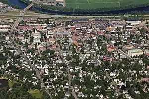 Concord is entirely within the Merrimack River watershed[9] and the city is centered on the river. The Merrimack runs from northwest to southeast through the city. The city's eastern boundary is formed by the Soucook River, which separates Concord from the town of Pembroke. The Turkey River passes through the southwestern quarter of the city. The city consists of its downtown, including the North End and South End neighborhoods, along with the four villages of Penacook, Concord Heights, East Concord, and West Concord.[10] Penacook sits along the Contoocook River, just before it flows into the Merrimack.