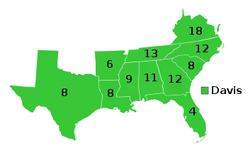 The Electoral College consisted of 109 electors.[6] The electors (chosen in the November 6 elections) met in their respective states to cast their votes on December 4, 1861 (Confederate law mandated that electors meet on the first Wednesday in December). The Congress met in joint session on February 19, 1862, and certified the result.[7] Davis and Stephens were inaugurated on February 22, 1862.