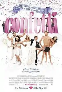 Confetti is a 2006 British mockumentary romantic comedy film released on 5 May 2006. It was conceived and directed by Debbie Isitt and stars many acclaimed British comedians, including Jessica Stevenson, Jimmy Carr, Martin Freeman, Mark Heap, Julia Davis, Robert Webb and Olivia Colman. It follows a bridal magazine competition for the most original wedding, the ultimate prize being a house, and the three couples who are chosen to compete. The film follows the contestants in a fly-on-the-wall documentary style, akin to The Office. The script was entirely improvised. The film was a box office success, grossing $4.9 million on a budget of $2 million.