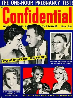 Confidential was a magazine published quarterly from December 1952 to August 1953 and then bi-monthly until it ceased publication in 1978. It was founded by Robert Harrison and is considered a pioneer in scandal, gossip and exposé journalism.