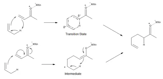 As seen in Figure 11, Lewis acid-catalyzed ene reactions can proceed either through a concerted mechanism that has a polar transition state, or through a stepwise mechanism with a zwitterionic intermediate. The ene, enophile and choice of catalyst can all influence which pathway is the lower energy process. In general, the more reactive the ene or enophile-Lewis acid complex is, the more likely the reaction is to be stepwise.[3]