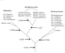 Mesophillic Thermoproteota were recently placed into a new phylum of Archaea called the Nitrososphaerota (formerly Thaumarchaeota). However there are very few molecular markers that can distinguish this group of archaea from the phylum Thermoproteota (formerly Crenarchaeota). A detailed phylogenetic study using the CSI approach was conducted to distinguish these phyla in molecular terms. 6 CSIs were uniquely found in various Nitrososphaerota, namely Cenarchaeum symbiosum, Nitrosopumilus maritimus and a number of uncultured marine Thermoproteota. 3 CSIs were found that were commonly shared between species belonging to Nitrososphaerota and Thermoproteota. Additionally, a number of CSIs were found that are specific for different orders of Thermoproteota—3 CSIs for Sulfolobales, 5 CSIs for Thermoproteales, lastly 2 CSIs common for Sulfolobales and Desulfurococcales. The signatures described provide novel means for distinguishing Thermoproteota and Nitrososphaerota, additionally they could be used as a tool for the classification and identification of related species.[17]