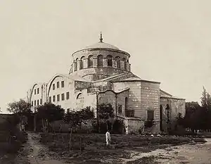 According to Socrates Scholasticus, Constantine commissioned the construction of the first Church of Hagia Irene in Constantinople, on the site now occupied by the Justinian church of the same name.[38] It commemorated the peace won by Constantine and Crispus's victory over Licinius and Licinius II at the Battle of Chrysopolis in 324; its name, the Church of the Holy Peace (Ancient Greek: Ἁγία Εἰρήνη, romanized: Hagía Eirḗnē, lit. 'Holy Peace') recalled the Altar of Peace (Latin: ara pacis) built by Augustus, the first deified Roman emperor.[38] Two other large churches were dedicated to Saint Mocius and to Saint Acacius; both worthies had supposedly been martyred in Byzantium during the Diocletianic Persecution.[38] The Church of St Mocius was supposed to have included parts of a former temple of Zeus or Hercules, though it is unlikely that such a temple existed on the site, which was without the walls of the Constantinian city as well as of erstwhile Severan Byzantium.[38] According to Eusebius, Christian liturgies were also performed in Constantine's Mausoleum, the site of which became the Church of the Holy Apostles; although Eusebius does not mention any Byzantine church by name, he reports that Christian sites were numerous inside the city and around it.[38] Later tradition ascribed to Constantine the foundations in Constantinople of the Church of Saint Menas, the Church of Saint Agathonicus, the Church of Saint Michael at nearby Anaplous, and the Church of Hagios Dynamis (Ancient Greek: Άγιος Δύναμις, romanized: Hagíos Dynamis, lit. 'Holy Power').[38]