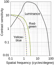 Log–log plot of spatial contrast sensitivity functions for luminance and chromatic contrast