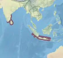 - Distribution after Conus Biodiversity website: from South India and Sri Lanka to Java and Bali in Indonesia.[4]