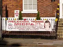 Sign outside Michael Shields's house on the day of his release