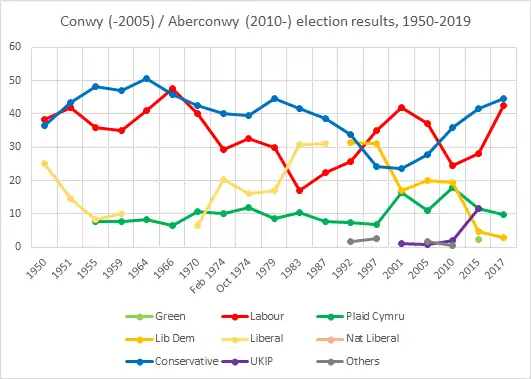 The last MP was Betty Williams of the Labour Party, who held the seat from 1997 (when she gained 35.04% of the vote—a 9.4% swing from the Conservatives) until its abolition in 2010. Williams increased her share of the vote in 2001 (by 6.8%), but it was reduced in 2005 (by 4.7%). She is also the first female MP to hold the seat. The seat was previously held (since its renaming in 1983) by Sir Wyn Roberts for the Conservative Party, who was first elected for Conway, the old anglicised name of the constituency, in 1970.