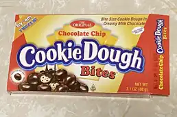 Cookie Dough Bites is an American candy owned by Taste of Nature, Inc.[1] With a cookie dough confectionery center, they are chocolate covered and most typically sold in theater-sized boxes. Although launched as a chocolate-chip cookie dough flavor, since their introduction, there have been a variety of flavors released. Originally launched in movie theaters in the US in 1997 they are now available in many areas of the world including Canada, the Caribbean, Mexico, UK, Europe/EU, several Middle Eastern countries, Australia and New Zealand