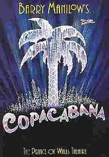 Copacabana, also known as Barry Manilow's Copacabana, is a 1994 stage musical with music by Barry Manilow, lyrics by Bruce Sussman and Jack Feldman, and book by Manilow, Sussman and Feldman. The show had its roots in an hour-long stage show, Barry Manilow Presents Copacabana, which played in Atlantic City in 1990 and 1991. The stage show was based on the 1985 musical TV film of the same name, in turn based on Manilow's 1978 hit song of the same title, which was co-written by Manilow, Sussman and Feldman. The full-length musical, which added a present-day framing device and many additional songs, premiered in the United Kingdom in 1994 and later toured the United States.[1] A cast album of the musical was released in 1994, titled Copacabana: Original London Cast Recording.
