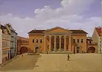 In the Great Fire of 1795, Copenhagen's city hall, located between Nytorv and Gammeltorv, was among the many buildings lost to the flames.[2] It was the second consecutive city hall at that spot to meet this fate; the first building, built in 1679 at the same site, had been lost in the Fire of 1728.[3]
