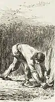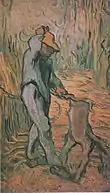 In man's mastery of the cycles of nature: "the sower and the wheat sheaf stood for eternity, and the reaper and his scythe for irrevocable death."[35] Of the reaper Van Gogh expressed his symbolic, spiritual view of those who worked close to nature in a letter to his sister in 1889: "aren’t we, who live on bread, to a considerable extent like wheat, at least aren't we forced to submit to growing like a plant without the power to move, by which I mean in whatever way our imagination impels us, and to being reaped when we are ripe, like the same wheat?"[51]