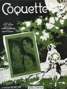 "Coquette" is a 1928 fox trot jazz standard. It was composed by Johnny Green and Carmen Lombardo, with lyrics by Gus Kahn.[1] Guy Lombardo had great success with the song in 1928.[2]