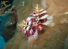 The sea hosts numerous species of anemones, sponges, worms (e.g. Spirobranchus giganteus shown in the photograph), gastropods, lobsters, crayfish, prawns and crabs. Red algae Lithothamnion and Porolithon colour many coral reefs purple-red and the green alga Halimeda is found throughout the sea. The coastal plants consisting of only about 30–40 species, and mangroves occur in the northern part of the sea.[11] Four hundred coral species, both hard corals and soft corals inhabit the reefs.[30] The majority of these spawn gametes, breeding in mass spawning events that are triggered by the rising sea temperatures of spring and summer, the lunar cycle, and the diurnal cycle. Reefs in the inner GBR spawn during the week after the full moon in October, while the outer reefs spawn in November and December.[31] Its common soft corals belong to 36 genera.[32] There are more than 1500 fish species in the reef systems.[33] Five hundred species of marine algae or seaweed live on the reef,[30] including thirteen species of the genus Halimeda, which deposit calcareous mounds up to 100 metres (110 yd) wide, creating mini-ecosystems on their surface which have been compared to rainforest cover.[34]
