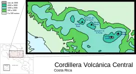 It contains four large volcanoes Poás (2,708 m), Barva (2,906 m), Irazú and Turrialba (3,340 m). The highest peak is Irazú at 3,432 m.[1]