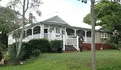Corinda was first settled in the 1860s as a small farming community. Among the original settlers was the Francis family who in 1862 purchased 21 acres, which extended from the Brisbane River to Francis Lookout, a local heritage listed landmark on Dewar Terrace. Francis Lookout survives to this day, and includes a small burial ground opened in 1862. Its ten graves include those of some of the pioneer settlers. The oldest of the graves is of Clement Francis who died in 1863. The lychgate, erected by Angela Francis, dates to 1902.[4] Most of the original older-style Queenslander homes date back to the colonial period and were built high on the hills around the lookout.