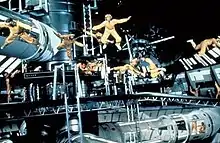 Since NASA's Space Shuttle program had not been launched, Derek Meddings[26] and his miniatures team had to create the rocket launch footage without any reference. Shuttle models attached to bottle rockets and signal flares were used for take-off, and the smoke trail was created with salt that fell from the models. The space scenes were done by rewinding the camera after an element was shot, enabling other elements to be superimposed in the film stock, with the space battle needing up to forty rewinds to incorporate everything. The climactic scenes of the space station disintegrating were created by Meddings and other members of the special effects team shooting the miniature model with shotguns.[7][27]