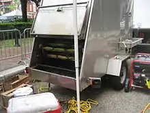 A corn roaster is a large grill for cooking large batches of ears of corn at the same time. The term "corn roaster" can also refer to a person who roasts corn.[1][2][3] Corn roaster machines have existed in the United States since at least 1900.[4] Corn roasters are used by concession vendors at festivals, fairs, events, parties, and holidays, such as the Fourth of July in the United States.[5][6] Roasted corn is a very popular festival food in the American South, Southwest, and Northwest. Corn roasters can also cook foods such as turkey legs, potatoes, and sweet potatoes. They may also be used by street food vendors.[7][8] Street vendors may operate seasonally, per the seasonality of corn crops.[8] Some organizations that operate corn roasters at events, such as fairs, donate their proceeds to charities.[9]