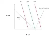 Another situation a corner solution may arise is when the two goods in question are perfect substitutes.[5] The word "corner" refers to the fact that if one graphs the maximization problem, the optimal point will occur at the "corner" created by the budget constraint and one axis.[4]