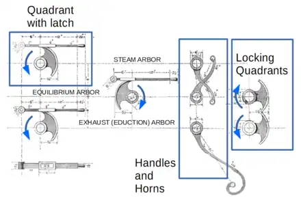 Even when operating the engine manually there are limits on how the engine can be configured. It is never appropriate to have both the exhaust and equilibrium valves open at the same time. To avoid this an additional pair of quadrants are used as “locking quadrants”. These are oriented so that in the closed position they lie almost touching, allowing either of them to move to the open position.[3]: 165 However once one is open it blocks the other from opening. Note that Pole[5]: 129 describes a more complex system of tappets and levers to achieve the same mutual locking effect between the exhaust and equilibrium valves.