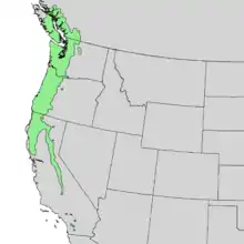 It occurs from the lowlands of southern British Columbia to the mountains of southern California. There exists an inland population in central Idaho, where it is considered critically imperiled. It occurs predominantly below 1,500 m (4,900 ft) in elevation.[5]