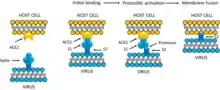 Infection begins when the viral spike protein attaches to its complementary host cell receptor. After attachment, a protease of the host cell cleaves and activates the receptor-attached spike protein. Depending on the host cell protease available, cleavage and activation allows the virus to enter the host cell by endocytosis or direct fusion of the viral envelope with the host membrane.[58]