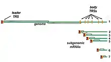 Transcription – The other important function of the complex is to transcribe the viral genome. RdRp directly mediates the synthesis of negative-sense subgenomic RNA molecules from the positive-sense genomic RNA. This process is followed by the transcription of these negative-sense subgenomic RNA molecules to their corresponding positive-sense mRNAs.[49] The subgenomic mRNAs form a "nested set" which have a common 5'-head and partially duplicate 3'-end.[62]
