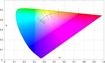 Close up of the CIE 1960 UCS. The isotherms are perpendicular to the Planckian locus, and are drawn to indicate the maximum distance from the locus that the CIE considers the correlated color temperature to be meaningful: